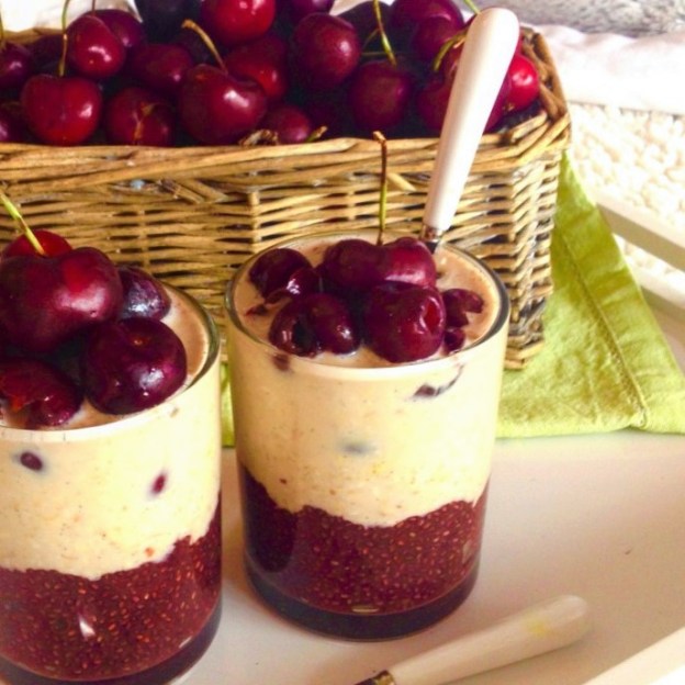 The next morning put out two pretty glasses and divide the Cherry Chia pudding amongst them. If the Chia pudding has become too stiff add a little more water and mix.