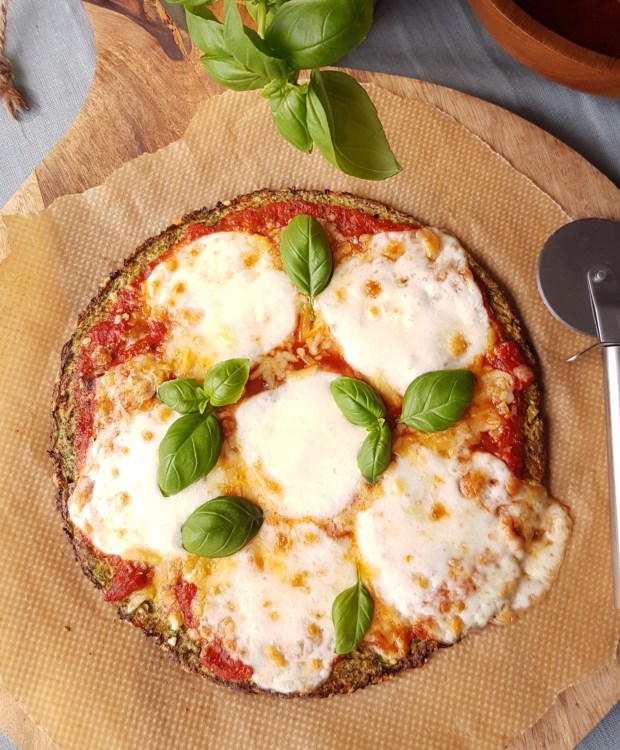 Divide onions, ham, broccoli and basil (reserve some for decorating) over the crust.