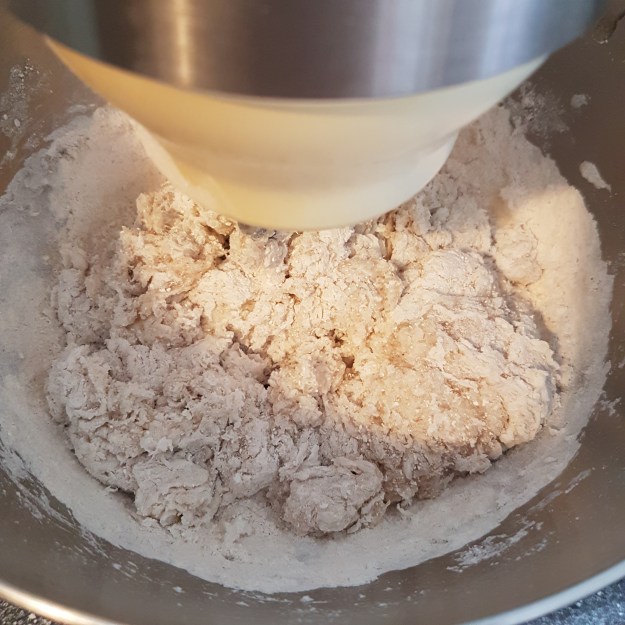 5. Mix until combined. It will not turn into a normal dough ball like what you are used to, but instead remain more crumbled.