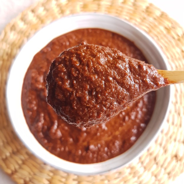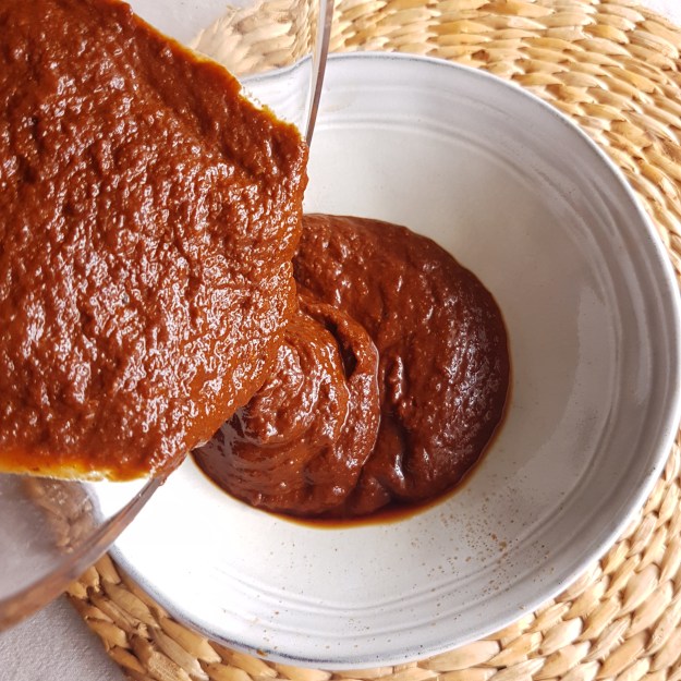 Once everything has cooled, place the hydrated peppers with liquid in the blender, with the onion-spice mixture, add the peppers from a jar, add the stock cubes, cocoa powder and sugar. Blend everything until you have a dark smooth puree, taste and season if necessary.